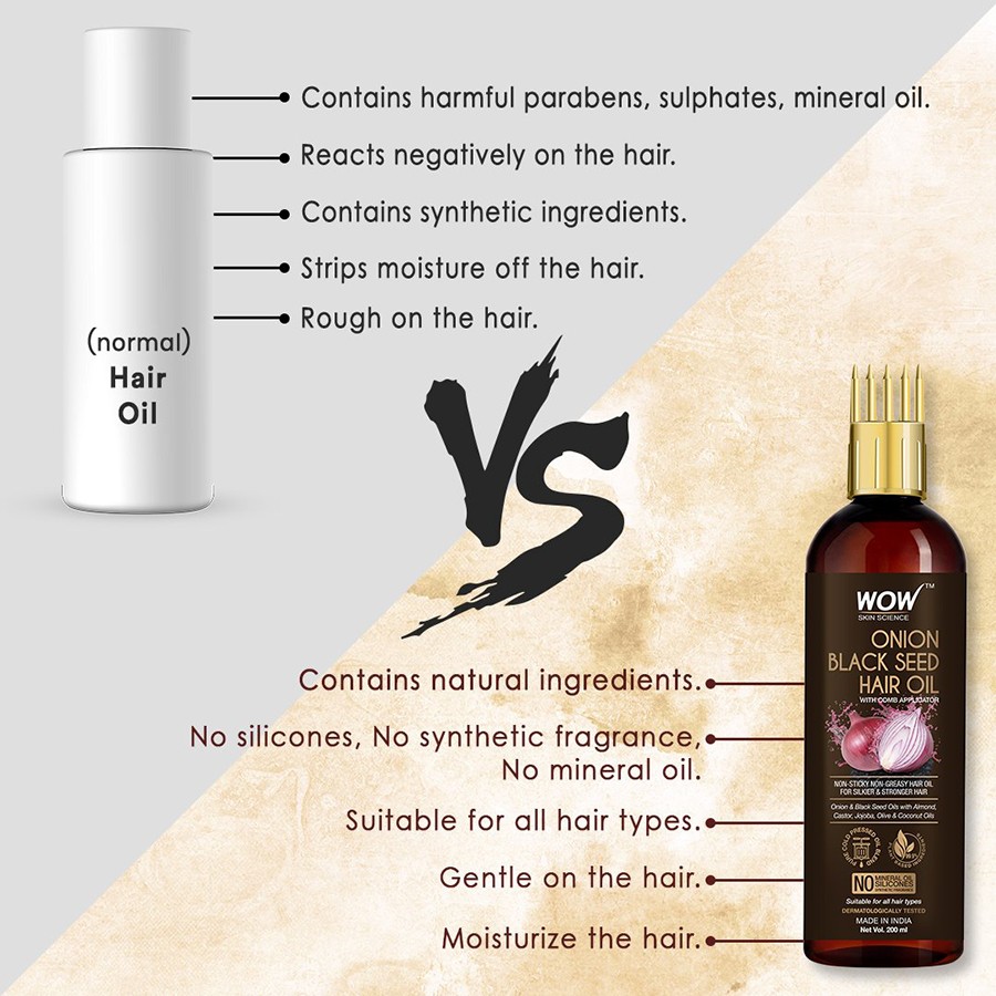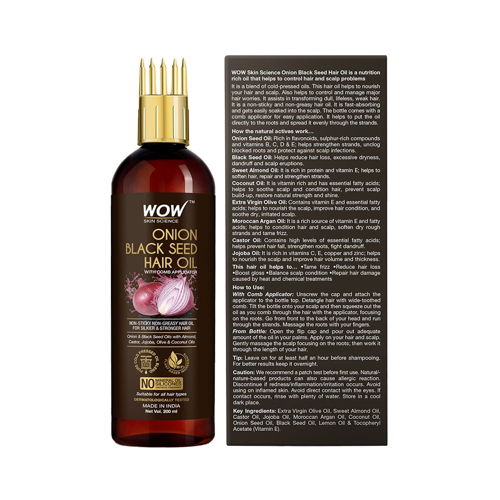 WOW Skin Science Onion Hair Oil is helps bring silkiness and strength to tresses, and improves the way hair looks, feels and behaves. Made with 100% pure cold pressed oils, 100% free of hexane, mineral oil and silicone for holistic hair care.